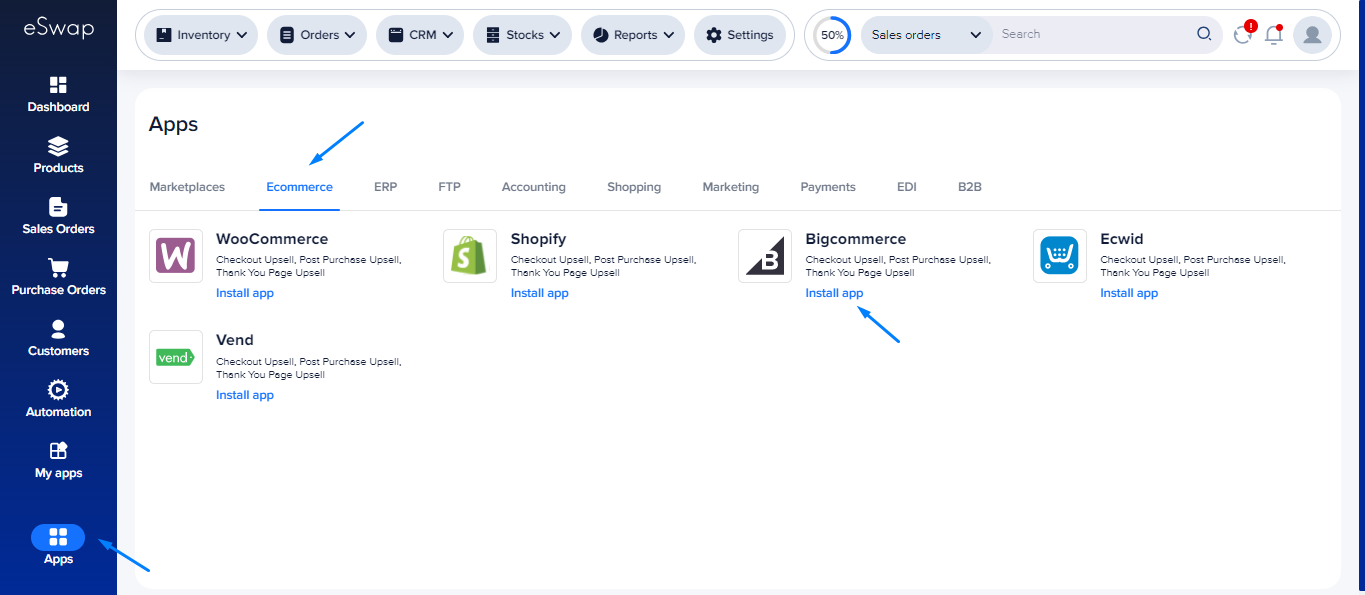 - Navigate to the Apps section in eSwap, particularly under “Ecommerce,” and select “BigCommerce.”