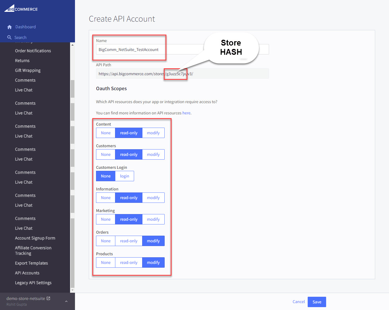 - Note: The Store HASH information can be found from the API Path textbox. It’s the value between “/stores/” and “/v3/”.