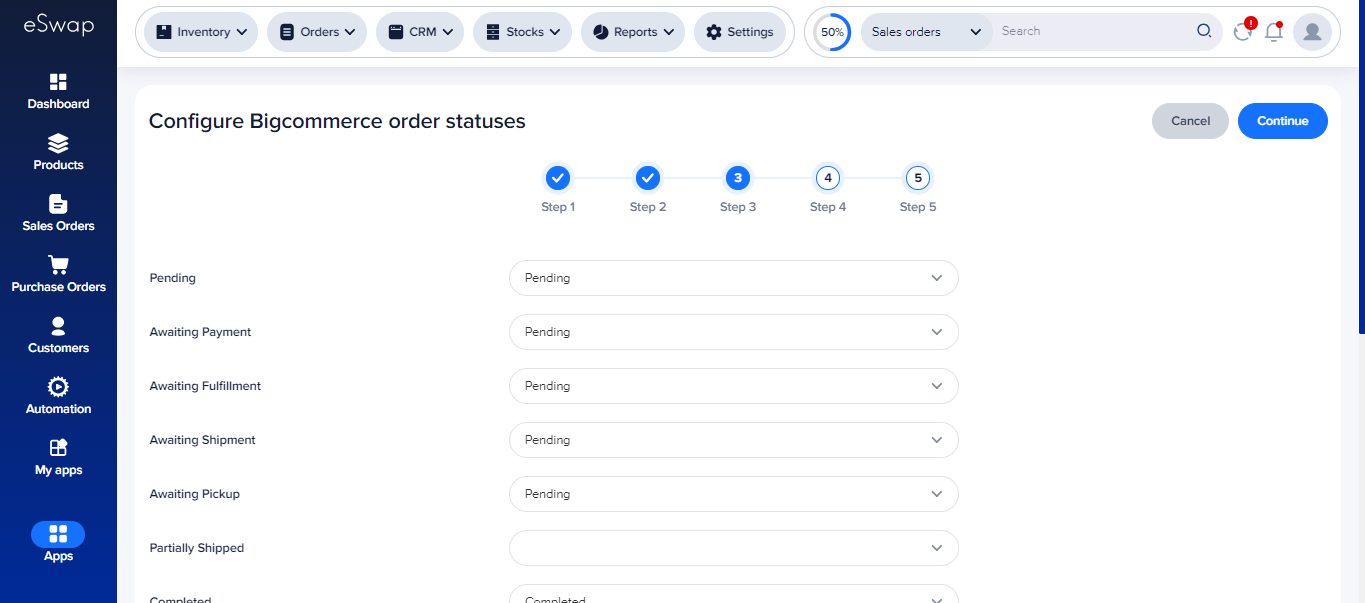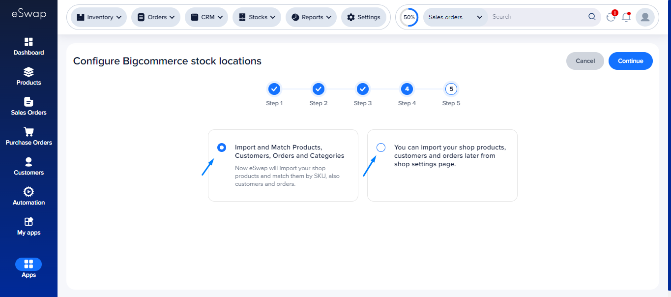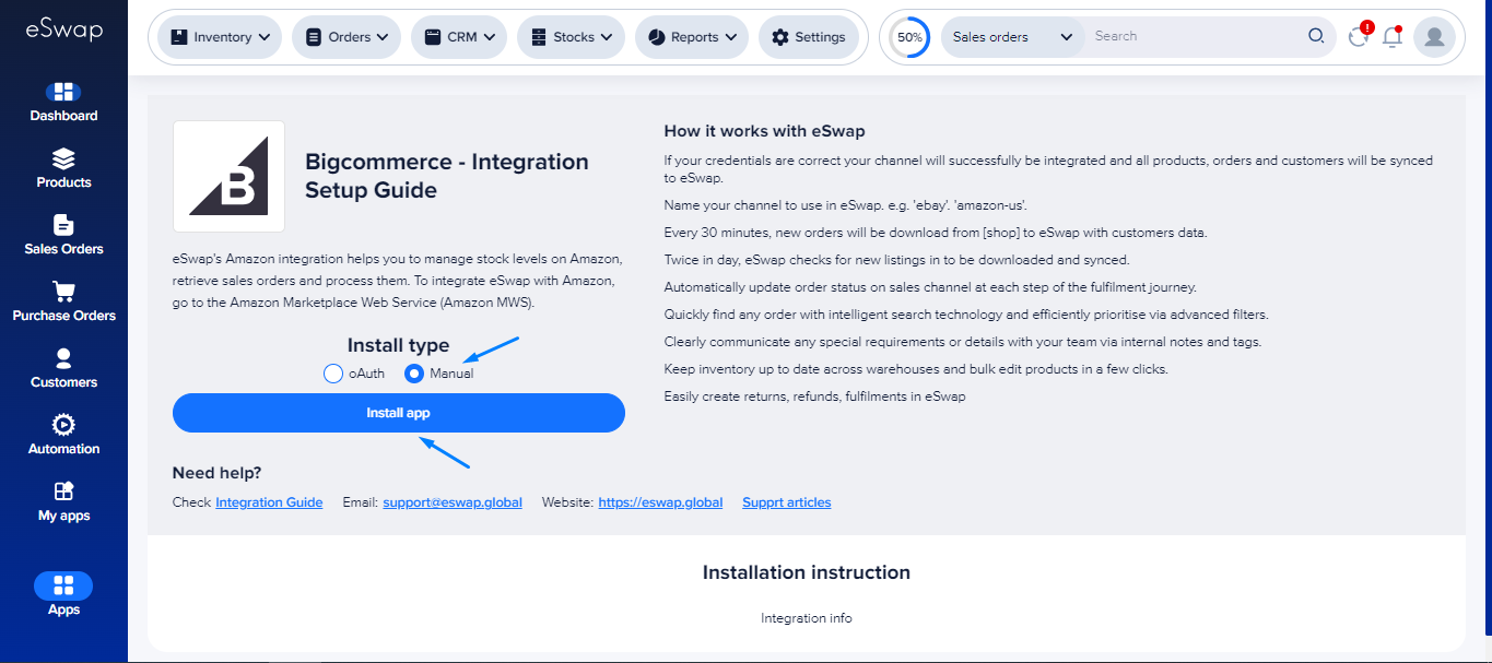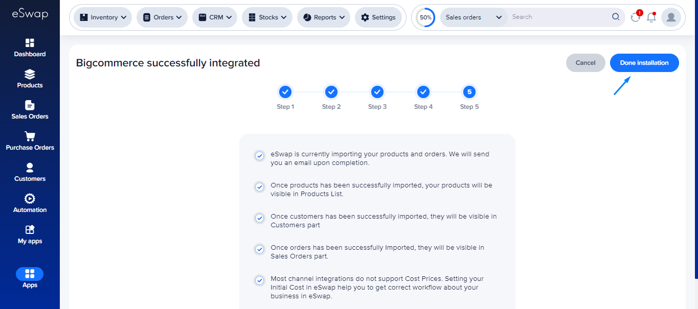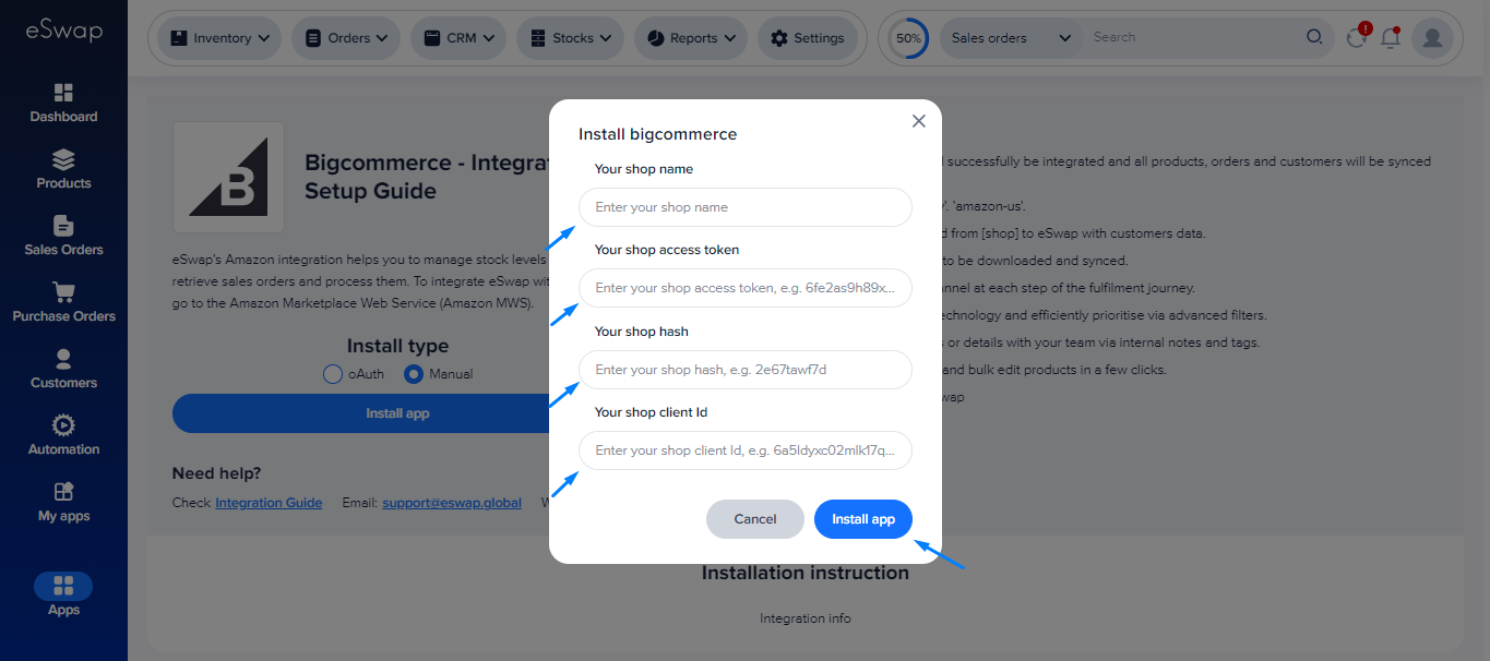 By following these steps, you will successfully connect your BigCommerce account to eSwap, enabling seamless data synchronization and management between the two platforms.
