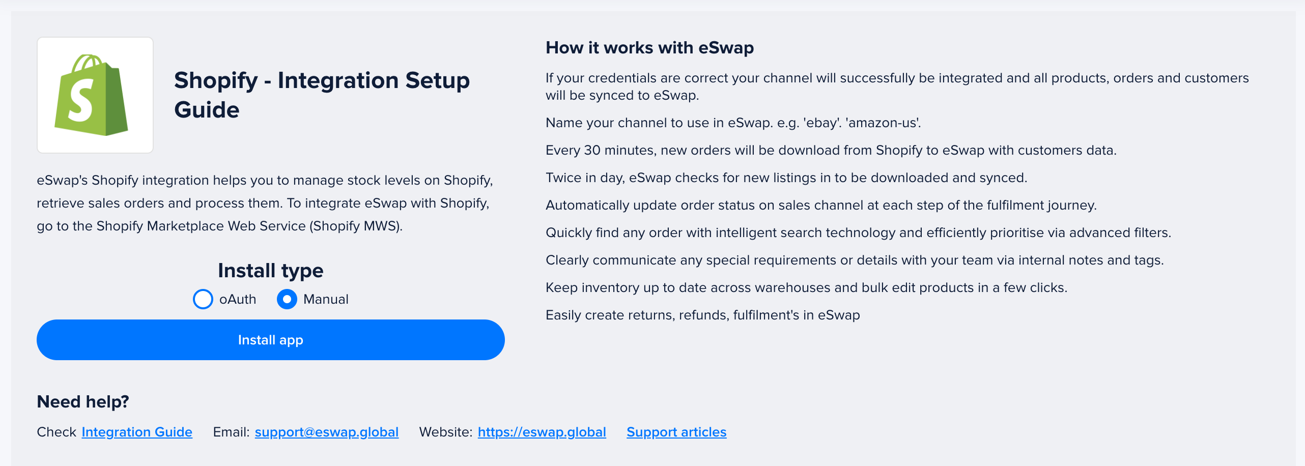 Your app is installed and all your products, orders and customers will be imported to eSwap.