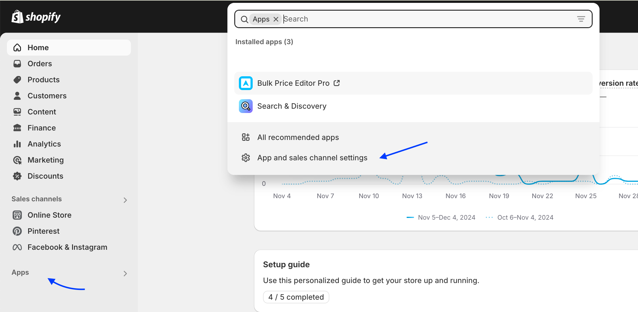 Navigate to your Shopify admin dashboard click on Apps -> Apps and Sales channel settings.