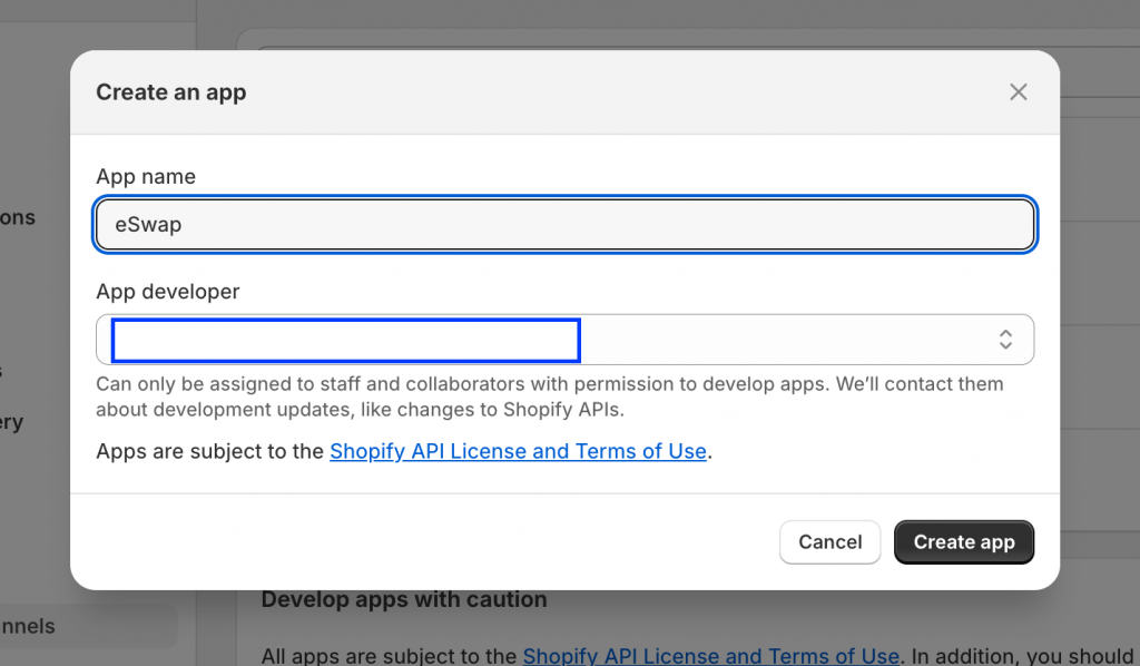 Now click on Develop Apps button then on Create app button . Give the app name eSwap and click on Create button.