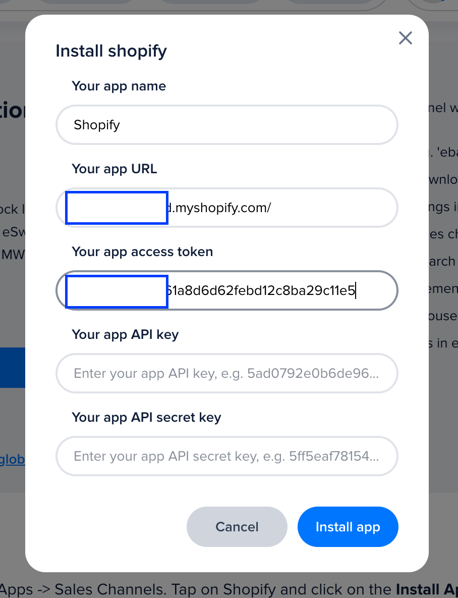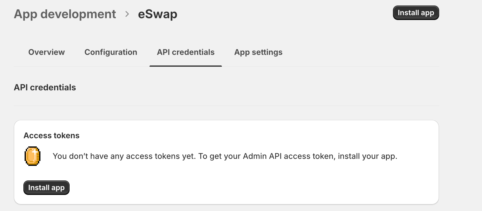 After saving navigate to API credentials tab and click on Install app button you will see the confirmation modal again.